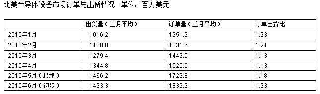 SEMI日前公布了2010年7月份北美半導(dǎo)體設(shè)備制造商訂單出貨比報告。按三個月移動平均額統(tǒng)計,7月份北美半導(dǎo)體設(shè)備制造商訂單額為18.3億美元,訂單出貨比為1.23。訂單出貨比為1.23意味著該月每出貨價值100美元的產(chǎn)品可獲得價值123美元的訂單。