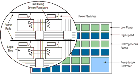 圖3所示為具有上述某些概念的FPGA架構(gòu),其可編程異構(gòu)架構(gòu)由高速度和低功耗兩個(gè)區(qū)組成。一個(gè)片上功耗模式控制器可管理各種降功耗模式,即深睡眠模式、懸掛模式和休眠模式。在架構(gòu)內(nèi)部,可以用專用的供電開關(guān)關(guān)掉每個(gè)邏輯塊的電源。通過布線架構(gòu)的通信信號(hào)流經(jīng)低擺幅驅(qū)動(dòng)器和接收器,以降低互連功耗。