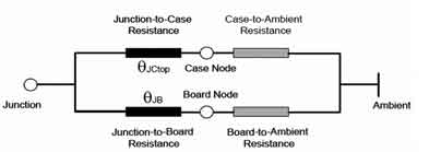 這樣就可以根據(jù)公式RJX=(TJ-TX)/Ploss求出結(jié)點(diǎn)到環(huán)境的熱阻RthJA(RthJA=RthJS+RthSA)。有關(guān)RthJA的計(jì)算,這里只介紹一種簡單的熱模型(Compactthermalmodel)2R模型,即Two-ResistorModel。其理論依據(jù)如圖4所示。