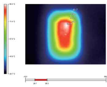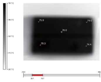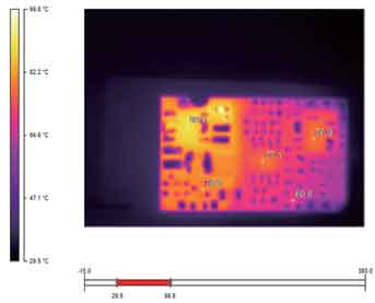 圖6~9是利用Ti20拍攝的金升陽公司12W產(chǎn)品的熱圖像。通過這些圖片,我們不僅可以清晰地看出整體的熱分布(相同的溫度,所用的顏色是一致的),還可以借助其提供的軟件分析每一個(gè)元器件此時(shí)對應(yīng)的溫度值,如幾個(gè)溫度相對較高的元器件的溫度值分別如表1所示。