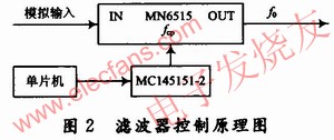 模擬器件的發(fā)展與集成為小型化提供了充分的條件,像松下公司的MN6515,僅為8腳,其帶通濾波器的中心頻率f0可由外加的時(shí)鐘頻率fcp控制,其比值fcp/f0約為15.7。只要改變fcp的值,帶通濾波器的中心頻率就會(huì)在O~32kHz范圍內(nèi)移動(dòng),非常方便,可采用圖2方式進(jìn)行控制。
