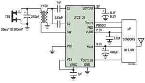 迄今為止,高集成度DC/DC升壓型轉(zhuǎn)換器一直比較缺少,這類轉(zhuǎn)換器可以收集和管理由極低的輸入電壓源提供的多余能量。不過(guò),LTC3108極大地簡(jiǎn)化了收集和管理由極低輸入電壓源提供的多余能量的任務(wù)。其升壓型拓?fù)湓谳斎腚妷旱椭?0mV時(shí)仍能正常運(yùn)行。這具有重大意義,因?yàn)樗试SLTC3108從低至1℃的溫度變化中收集TEG提供的能量。