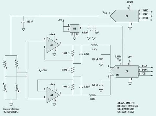 上例電路的液壓傳感器屬于電阻性電橋,傳感器的輸出取決于電阻值的變動(dòng)及驅(qū)動(dòng)電阻的電壓,并與兩者有函數(shù)上的關(guān)系。圖3所示的傳感器具有0.2mV/V的敏感度。DAC081S101是一款8位的數(shù)字/模擬轉(zhuǎn)換器,可以改變驅(qū)動(dòng)電橋的電壓,以便為液壓測量電路提供增益控制。例如,數(shù)字/模擬轉(zhuǎn)換器輸出若設(shè)定為4V,那么全標(biāo)度液壓便可達(dá)25.6PSI。若輸出電壓為1V,全標(biāo)度液壓便高達(dá)102PSI。