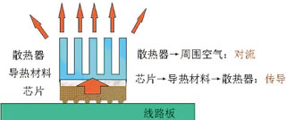 由于散熱器底面與芯片表面之間會(huì)存在很多溝壑或空隙,其中都是空氣。由于空氣是熱的不良導(dǎo)體,所以空氣間隙會(huì)嚴(yán)重影響散熱效率,使散熱器的性能大打折扣,甚至無法發(fā)揮作用。為了減小芯片和散熱器之間的空隙,增大接觸面積,必須使用導(dǎo)熱性能好的導(dǎo)熱材料來填充,如導(dǎo)熱膠帶、導(dǎo)熱墊片、導(dǎo)熱硅酯、導(dǎo)熱黏合劑、相轉(zhuǎn)變材料等。如圖2所示,芯片發(fā)出的熱量通過導(dǎo)熱材料傳遞給散熱器,再通過風(fēng)扇的高速轉(zhuǎn)動(dòng)將絕大部分熱量通過對流(強(qiáng)制對流和自然對流)的方式帶走到周圍的空氣中,強(qiáng)制將熱量排除,這樣就形成了從芯片,然后通過散熱器和導(dǎo)熱材料,到周圍空氣的散熱通路。