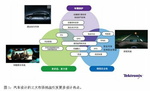 然而,面對(duì)日益復(fù)雜的汽車(chē)設(shè)計(jì)需求,特別是要推出中高端和商用的新能源汽車(chē)之時(shí),自主創(chuàng)新和開(kāi)發(fā)之路并非坦途。泰克科技的專(zhuān)家曾在不久前舉辦的一場(chǎng)汽車(chē)電子技術(shù)論壇上以擁有“100多個(gè)ECU、軟件代碼已經(jīng)達(dá)到700萬(wàn)行”的豐田L(fēng)exus460汽車(chē)為例,強(qiáng)調(diào)了電子部件在汽車(chē)特別是高端汽車(chē)中所占據(jù)的比例越來(lái)越高。“如圖1,汽車(chē)電子關(guān)乎目前汽車(chē)設(shè)計(jì)的三大市場(chǎng)挑戰(zhàn),即如何滿(mǎn)足生態(tài)(環(huán)境保護(hù))、更舒適方便和增強(qiáng)安全性的要求,而圍繞解決這些挑戰(zhàn)的系統(tǒng)和子系統(tǒng)正是目前汽車(chē)電子設(shè)計(jì)的熱點(diǎn)和難點(diǎn)。”他指出。“而局域網(wǎng)、動(dòng)力系統(tǒng)、電子控制單元和數(shù)字RFID的應(yīng)用在改善汽車(chē)生態(tài)學(xué)、安全性和舒適性方面扮演了重要的角色。