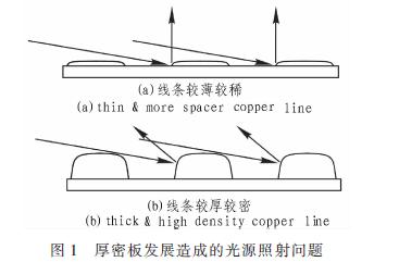 在PCB行業(yè)的發(fā)展中,目前存在以下3大趨勢,即線條更細(xì)、線距更小密度更高、高度差更加明顯。本文使用的厚密板即是該趨勢的集中體現(xiàn)。如圖l(a)是普通光源應(yīng)用在線距大、厚度小的PCB上的光線路徑。圖1(b)是普通光源應(yīng)用在線距小、厚度大的PCB上的光線路徑。