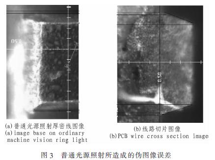 從圖中可以清晰地看到,目前的普通光源攝取的圖像和真實(shí)的截面圖有明顯的邊緣偏差,在2X的倍率下,1像素對應(yīng)的物面尺寸為1.61μm。偽圖像邊緣造成的線寬差別超過3像素。使得系統(tǒng)準(zhǔn)確度大為降低。該偽圖像邊緣產(chǎn)生的原因是由于普通光源光線照射角度過小。被厚密線路遮擋大部分光線后,基材和下線寬的亮度和顏色非常接近。而一般的線寬測試中,并沒有將該偏差計(jì)入測量結(jié)果。致使測量值產(chǎn)生一個(gè)固有方向的系統(tǒng)誤差,也就是說,如果該誤差不能被消除,所測得的數(shù)據(jù)不是真實(shí)PCB的線路特征的反映。而該誤差并不能通過改變圖像的清晰程度和對比度消除,只能依據(jù)PCB厚密線路的特點(diǎn)去改變光源的設(shè)計(jì)來消除或減小該誤差。