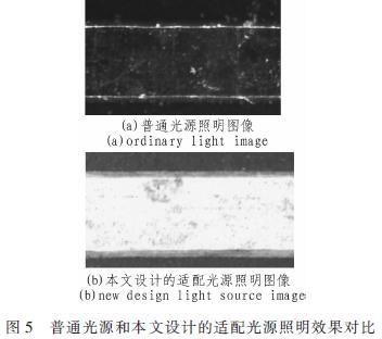 從圖5可以看出,使用普通光源僅僅能將上線寬附近的法線方向接近水平45°的線路照亮,如圖5(a)中兩根橫向亮線。由于厚密線路對光線的強(qiáng)烈遮擋作用,基材部分亮度非常低且接近下線寬亮度,肉跟幾乎不可分辨其差別。而由于線路表面的反射接近鏡面反射,導(dǎo)致到達(dá)線路表面的光線不能進(jìn)入鏡頭的收光光錐,上線寬以內(nèi)亮度也非常低。圖像沒有將PCB線路信息有效記錄,分析下線寬的精度很低且上線寬有固定系統(tǒng)誤差。而使用本文設(shè)計(jì)的適配光源的圖像,均勻度和清晰度良好。由于光源角度經(jīng)過仔細(xì)考慮,使得基材/線路過渡/線路表面的亮度呈現(xiàn)出階梯式上升且不同特征之間過渡區(qū)域小,有利于提高測試精度,實(shí)現(xiàn)對所關(guān)注線路的照明及信息提取。對于圖像處理來說是非常理想的源圖像。