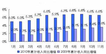 圖1 2010年1~11月通信業(yè)收入累計(jì)增幅 ——移動(dòng)電話用戶增長(zhǎng)再創(chuàng)新高,固定電話拆機(jī)放緩