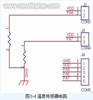 J2和J3是溫度傳感器的兩個(gè)接口,其中J2和J3分別是頂蓋和底盤溫度傳感器的接口,單片機(jī)檢測(cè)的信號(hào)實(shí)際上是與溫度傳感器分壓的電阻的電壓值,由于溫度傳感器的電阻值會(huì)隨溫度的上升而減小,所以分壓電阻的電壓值間接反映了某一時(shí)刻的溫度,電路原理圖如圖3-4所示: