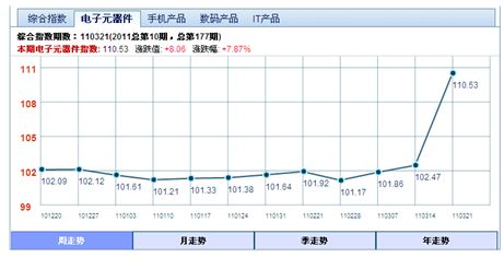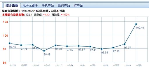 需要特別指出的是,四大成分指數(shù)之一的電子元器件指數(shù)的漲幅最為明顯,本期指數(shù)從3月14日的102.47點(diǎn),漲到了110.53點(diǎn),漲幅為7.87%,也是3年來之最??磥恚毡镜卣饘?duì)華強(qiáng)北指數(shù)的影響也是達(dá)到了峰值,也充分說明,華強(qiáng)北電子元器件市場(chǎng)已經(jīng)受到了日本地震的強(qiáng)烈沖擊。