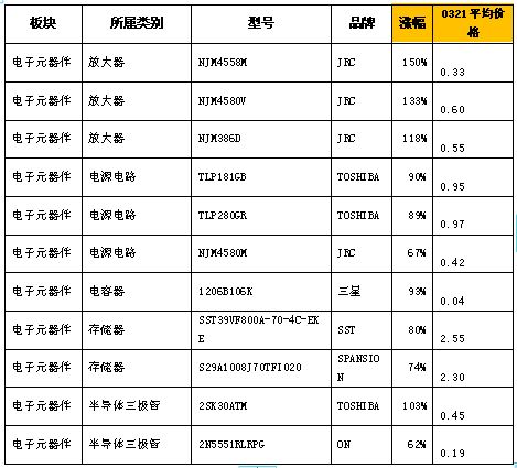 從我們采集到的數(shù)據(jù)來看,閃存開始呈現(xiàn)明顯上漲趨勢(shì)。3月15日,東芝閃存報(bào)價(jià)已經(jīng)上漲50%,而三星、現(xiàn)代也提價(jià)6%-26%;從通用元器件來說,日系的產(chǎn)品已經(jīng)全線上揚(yáng),而且是全面缺貨。下表為3月21日的電子元器件漲幅排行表,可以看出,漲幅最大的幾乎都是受災(zāi)企業(yè)的產(chǎn)品。