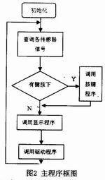 主程序的主要功能是循環(huán)調(diào)用顯示子程序、按鍵子程序,查詢各輸入信號(hào)狀態(tài),根據(jù)按鍵設(shè)定的各種參數(shù)和各輸入信號(hào)狀態(tài)控制各執(zhí)行機(jī)構(gòu),完成對(duì)PCB周轉(zhuǎn)箱托架系統(tǒng)的傳動(dòng)控制,以及對(duì)PCB板的有序傳送,判別系統(tǒng)運(yùn)行狀態(tài)是否異常,并及時(shí)報(bào)警或解除報(bào)警。主程序框圖如圖2所示。