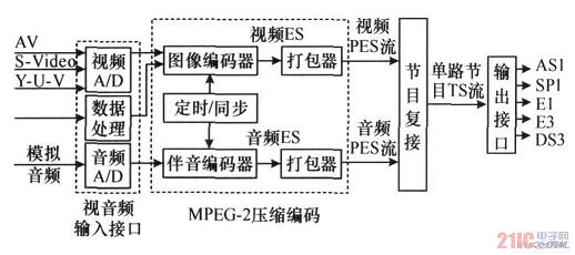MPEG-2壓縮編碼器是將模擬電視視音頻信號(hào)進(jìn)行MPEG-2壓縮編碼輸出實(shí)時(shí)TS流的前端設(shè)備,適用于數(shù)字電視的傳輸或前端信源編碼以及會(huì)議電視、遠(yuǎn)程教育等各種應(yīng)用,一臺(tái)高級(jí)的編碼器不僅具有DVB接口,還應(yīng)當(dāng)設(shè)有電信接口,以使該設(shè)備能方便地在HFC網(wǎng)絡(luò)、微波MMDS或8GHZ系統(tǒng)、SDH或PDH等網(wǎng)絡(luò)中應(yīng)用,如圖1所示。