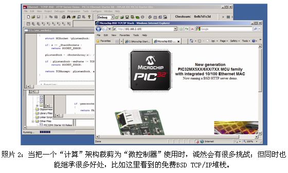 多年來Microchip 一直在為其小型的PIC 芯片提供部分網(wǎng)絡(luò)軟件棧,PIC32 做得更多,它提供了全功能、免費(fèi)的BSD TCP/IP 網(wǎng)絡(luò)堆棧。包含所有的網(wǎng)絡(luò)服務(wù)、套接字等,以及這些常用的協(xié)議:DHCP、UDP、ICMP、ARR 等。''795 型芯片中有512KB 的片上flash,有充足的空間存儲一些漂亮的演示程序,讓我們?yōu)g覽一下入門電路板(見照片2)。