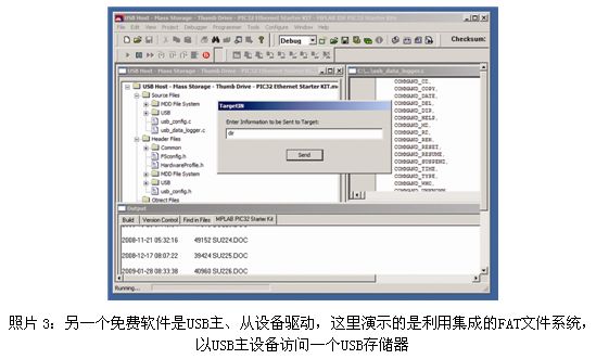 這個套件包含了一些實(shí)用的演示。其中一個演示讓該板子成為一個標(biāo)準(zhǔn)人機(jī)接口設(shè)備(HID)——比如鼠標(biāo)。因?yàn)镠ID 驅(qū)動已經(jīng)是標(biāo)準(zhǔn),你可以把它直接插入PC 使用。另外,你可以把這個套件配置成USB 主設(shè)備,從而利用PIC32 不斷完善的FAT 文件管理軟件庫,有一些演示展示了如何訪問廣泛使用的USB 存儲器(見照片3)。