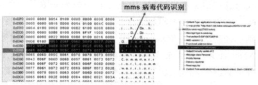 在網(wǎng)絡(luò)運(yùn)行的過(guò)程中,我們收到了如下的用戶(hù)投訴:“我的手機(jī)出現(xiàn)了1個(gè)奇怪的問(wèn)題,它總是自動(dòng)隨機(jī)發(fā)送MMS消息給我電話(huà)薄中的聯(lián)系人”。有的用戶(hù)投訴“收到1個(gè)可疑彩信,由1個(gè)txt文件和1個(gè)可執(zhí)行文件組成。txt文件為‘matrixremoveyou,removematrix’”。經(jīng)過(guò)確認(rèn),這些用戶(hù)的手機(jī)中了手機(jī)彩信病毒。根據(jù)病毒彩信樣本,顯示該病毒為“CommWarrior.A”病毒。具體病毒特征如圖1所示。