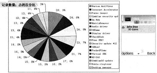 當(dāng)用戶(hù)打開(kāi)含有CommWarrior病毒的MMS消息后,該病毒將在手機(jī)中進(jìn)行安裝,并開(kāi)始向手機(jī)號(hào)碼薄中的用戶(hù)隨機(jī)發(fā)送含有自身拷貝的MMS消息。同時(shí),CommWarrior會(huì)偽造彩信主題進(jìn)行傳播,通常包含著這樣的內(nèi)容“來(lái)自我的3D游戲!免費(fèi)!”以及“適合所有型號(hào)諾基亞手機(jī)的鈴聲”等,使得接受彩信的用戶(hù)不會(huì)引起警覺(jué),具體各類(lèi)的消息內(nèi)容的比例如圖2所示。
