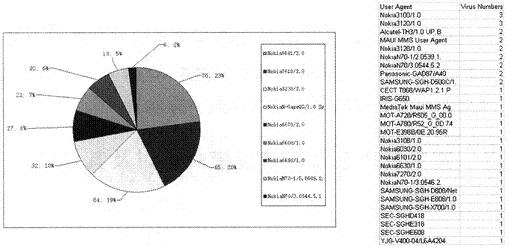 通過(guò)GPRS核心網(wǎng)抓包分析,目前用戶(hù)感染的彩信病毒類(lèi)型主要是CommWarrior病毒,A,B,C分別是其的變種類(lèi)型,具體感染的比例參見(jiàn)圖3。
