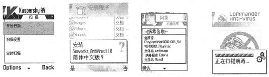 (3)針對(duì)目前智能手機(jī)感染的典型病毒:CommWarrior、Cabir手機(jī)病毒和Mabir.A手機(jī)病毒,各軟件公司已經(jīng)陸續(xù)推出了一些防病毒軟件,如NetQin手機(jī)殺毒系統(tǒng)、金山手機(jī)毒霸、卡巴斯基手機(jī)殺毒軟件、光華反病毒手機(jī)殺毒軟件SymbianS60、TSG_Phone_Safe_殺手機(jī)病毒軟件、Anti-Virus.v1.10、Simworks_AnitiVirus_1.16等。各運(yùn)營(yíng)商可以推薦用戶(hù)進(jìn)行相關(guān)軟件的加載,手機(jī)廠(chǎng)家也可以根據(jù)自身情況出廠(chǎng)時(shí)預(yù)裝一些殺毒軟件(見(jiàn)圖5)。