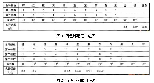 現(xiàn)在常用的固定電阻都用色環(huán)法來表示它的標(biāo)稱阻值和誤差。色環(huán)法就是用顏色表示元件的標(biāo)稱阻值和誤差,并直接標(biāo)志在產(chǎn)品上的一種方法。常見的色環(huán)電阻有四環(huán)和五環(huán)電阻兩種(其中五環(huán)電阻屬于精密電阻)。一般由四道色環(huán)或五道色環(huán)來表示其標(biāo)稱阻值和誤差,各種顏色代表不同的數(shù)值,色環(huán)顏色所代表的數(shù)字或意義如表1和表2所示。