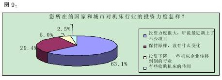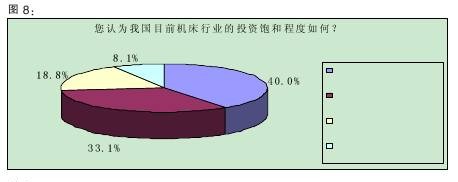 調(diào)查數(shù)據(jù)顯示,40.0%的受訪者認(rèn)為我國(guó)目前機(jī)床行業(yè)的投資“大體上飽和,但還有投資空間”,33.1%認(rèn)為“不飽和,還需要加大投資力度”。(詳見圖8)該結(jié)果表明,三分之一的被訪者認(rèn)為機(jī)床行業(yè)還有投資的空間,加上那些認(rèn)為投資空間很大的比例,有超過(guò)一半的人認(rèn)為機(jī)床行業(yè)還應(yīng)該增加投資,業(yè)界對(duì)機(jī)床行業(yè)的預(yù)期由此可見一斑。