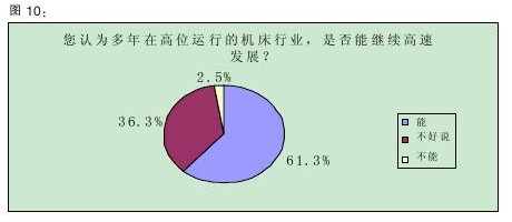 據(jù)年初中國(guó)機(jī)床工具工業(yè)協(xié)會(huì)的預(yù)測(cè),2011年機(jī)床行業(yè)總體增幅將大于10%。從本次調(diào)查的情況來(lái)看,業(yè)界對(duì)行業(yè)的增長(zhǎng)預(yù)期要比協(xié)會(huì)方面直接和樂(lè)觀許多,有61.3%的受訪者認(rèn)為,多年來(lái)高位運(yùn)行的機(jī)床行業(yè)“能繼續(xù)高速發(fā)展”,而持“不能”態(tài)度的人僅占2.5%(詳見圖10)。