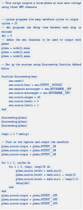 這部分包含許多腳本例子說明吉時利支持腳本的儀器的一些特點。圖1示出了兩臺吉時利系統(tǒng)源表如何使用單腳本控制產(chǎn)生3相交流波形。在這個例子中,使用吉時利的TSP-Link技術連接這兩臺儀器,因而很容易用腳本控制這兩臺儀器。
