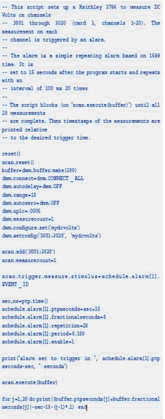 圖2說明了基于LXI Class B技術的定時器如何控制腳本工作。在此腳本中,吉時利3706型LXI Class B儀器使用基于IEEE 1588的計時器排列一系列測量的順序。LXI Class B的定時特點特別適合避免或最小化由延遲或通信時延導致的系統(tǒng)時延。