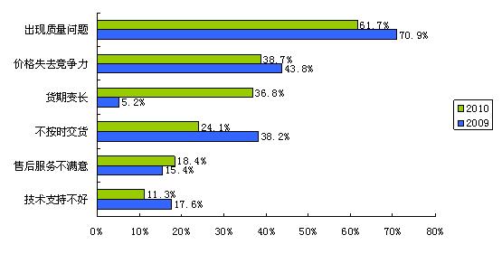 在缺貨的大環(huán)境下,不少電子系統(tǒng)制造商被迫更換供應商。導致合格供應商降級的最主要因素依次是物料出現(xiàn)質量問題、價格失去競爭力和貨期變長。物料質量問題在任何情況下都是不可妥協(xié)的;價格失去競爭力也就是價格上漲壓縮了下游公司的利潤空間;而貨期變長導致供應商降級的比例變化最顯著,由2009年的5.2%大幅上升至2010年的36.8%——這是供應鏈調整的表現(xiàn)。因此,系統(tǒng)廠商在考察新供應商時,除了考察物料質量因素外,產品性價比和供貨能力也是重要的考慮因素。