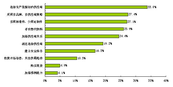 為了應對采購風險,采購商采取了綜合的應對措施,其中最主要的三種方式是:選擇生產資源好的供應商、采用多品牌多供應商策略、多用通用件少用定制件。不同營業(yè)規(guī)模和不同終端產品的公司也表現(xiàn)出各自不同的應對措施。更多詳細內容請關注電子元件技術網(wǎng)出版的《2011供應商管理調查報告》。