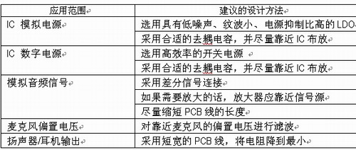 在便攜式音頻系統(tǒng)中,主電源通常是電池。由于系統(tǒng)其它部分(包括無線收發(fā)器、存儲器和顯示器等)造成的瞬態(tài)變化,使得電池的噪聲非常大。因此在給音頻編解碼器或DAC以及其它音頻信號路徑上的器件(如放大器等)提供模擬電源時,最好不要直接使用電池電壓,而是使用具有良好電源抑制比(PSRR)和低輸出噪聲的低壓降穩(wěn)壓器(LDO)。這樣可確保模擬電路有‘潔凈’的工作電源。需要仔細選擇LDO,確保其額定電流能足以滿足所供電電路的需求。在模擬電源端去耦電容的使用方法也很重要。大的去耦電容(10µF 以上)非常適合電源濾波。數(shù)值較小的去耦電容(1µF以下)在提供IC所需的快速瞬變電流時也是必需的。去耦電容必須盡可能靠近模擬電源引腳放置,并在電容和電源與地的連接中盡可能避免出現(xiàn)PCB過孔。相對于比較大的電容來說,較小的去耦電容要更靠近IC引腳擺放,因為串聯(lián)電阻對較小電容的響應(yīng)時間影響較為顯著。