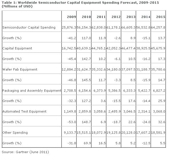 半導(dǎo)體資本設(shè)備市場的所有領(lǐng)域預(yù)計都將在2011年呈現(xiàn)增長態(tài)勢(見表一)。 Gartner分析師表示,2011年的支出是由積極的晶圓設(shè)備制造支出,處于領(lǐng)先的集成設(shè)備制造商(IDM)邏輯能力的加速生產(chǎn),以及內(nèi)存公司加速雙重曝光等因素推動的。2012年,半導(dǎo)體資本設(shè)備支出將下滑2.6%,隨后將在2013年增長8.9%。隨著內(nèi)存供過于求的影響,周期性的下跌應(yīng)該在 2013年底出現(xiàn)。