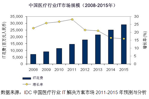 區(qū)域醫(yī)療信息平臺建設(shè)已逐步成為醫(yī)療信息化發(fā)展的引擎,醫(yī)療信息化市場繼續(xù)高速增長。根據(jù)IDC最近發(fā)布的報告《中國醫(yī)療行業(yè)IT解決方案市場2011-2015年預(yù)測與分析》,2010年醫(yī)療行業(yè)IT花費是114.1億元人民幣,較2009增長26.7%;預(yù)測到2015年IT花費市場規(guī)模達(dá)到290.2億元,2010至2015年的年復(fù)合增長率為20.5%。在各類醫(yī)療解決方案中,區(qū)域醫(yī)療信息平臺的增長最快,2010-2015年復(fù)合增長率達(dá)24.7%。