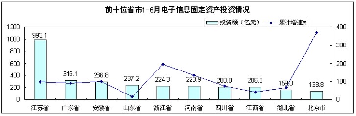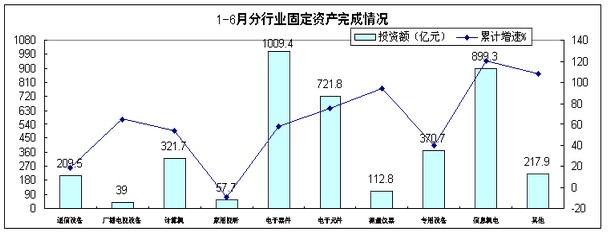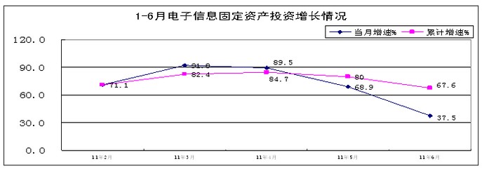 上半年,電子信息產(chǎn)業(yè)500萬(wàn)元以上項(xiàng)目完成投資3960億元,規(guī)模接近去年前三季度水平,同比增長(zhǎng)67.6%,高于去年同期26.6個(gè)百分點(diǎn),高于同期工業(yè)投資40.7個(gè)百分點(diǎn)。自二季度起,投資增速高位回落,6月份增速(37.5%)比4、5月份分別回落52和31.4個(gè)百分點(diǎn)。