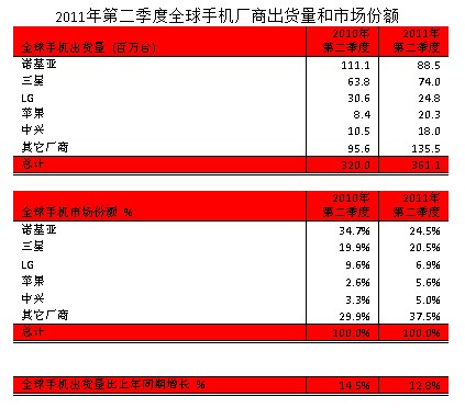 日前,據(jù)Strategy Analytics最新研究顯示,2011年二季度全球手機(jī)出貨量比去年同期增長(zhǎng)13%,達(dá)到3.611億臺(tái)。諾基亞出現(xiàn)自1999年以來(lái)最大下滑,而蘋果已經(jīng)接近排名第三的LG。