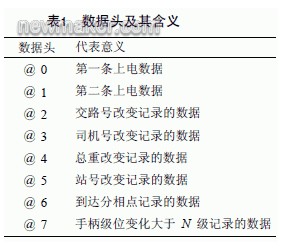 該裝置采用了大容量的存儲器。由于機(jī)車運(yùn)行的數(shù)據(jù)較多,為了降低GPRS 的使用成本,對于所有采集的信息均采用非分區(qū)定長壓縮方法[2]存儲,每包數(shù)據(jù)定長35 個(gè)字節(jié),由數(shù)據(jù)頭、公共數(shù)據(jù)、數(shù)據(jù)幀標(biāo)識、數(shù)據(jù)校驗(yàn)位等4 部分組成。數(shù)據(jù)頭占一個(gè)字節(jié),公共數(shù)據(jù)占32 個(gè)字節(jié),數(shù)據(jù)幀標(biāo)識和校驗(yàn)結(jié)果各占一個(gè)字節(jié)。由于每包數(shù)據(jù)只有35 個(gè)字節(jié),不能包含所有的機(jī)車運(yùn)行信息,因此在上電的時(shí)候?qū)⑼暾囊粭l機(jī)車運(yùn)行信息拆分成兩包發(fā)送。另外,@7 代表的級位變化大小N 的值可以在程序中設(shè)定。數(shù)據(jù)頭及其具體含義如表1 所示。