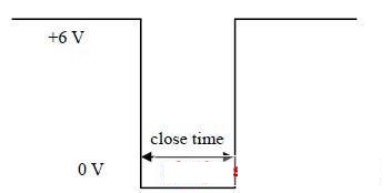 采用可控制開關(guān)的辦法難于完成測量,需采用其他辦法進行繼電器觸點通斷過程的模擬。首先對繼電器觸點處電壓波形進行分析,由于瞬時通斷測量儀接入抖閉觸點的電壓為6 V,通過抖斷觸點的電流為10 mA,當繼電器觸點出現(xiàn)抖閉現(xiàn)象時電壓波形應(yīng)如圖3 所示(抖閉觸點在正常狀態(tài)時所加的+6 V 電壓在抖閉狀態(tài)時被直接短路,電位被鉗制在0 V),形成一個負跳變脈沖,其抖閉時間為脈沖寬度,而出現(xiàn)抖斷觸點的電壓波形如圖4 所示。