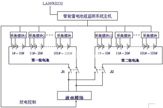 與電池巡檢儀不同,在這個系統(tǒng)增加了一個放電模塊,放電模塊能承受較大的沖擊電流,它接收監(jiān)控主機的放電命令,接通放電回路,電池通過負載放電,同時采集模塊將采集每節(jié)電池電壓的變化,在主機中得到了每節(jié)電池內(nèi)阻特性曲線。放電模塊也可作為長時間放電負載,實現(xiàn)對電池容量的核對性測試及整組電池的活化處理。這個系統(tǒng)實現(xiàn)對蓄電池全方面的監(jiān)測和維護管理。