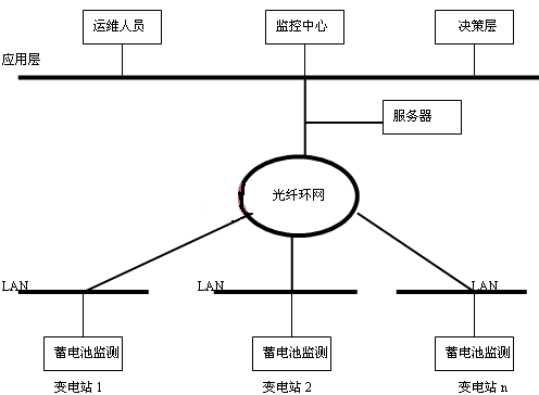 蓄電池在線監(jiān)測還可以利用通訊手段進行網(wǎng)絡(luò)化管理(如圖4),將幾個站或一地區(qū)的蓄電池監(jiān)測通過光纖進行組網(wǎng),建立一個實時遠程智能化蓄電池監(jiān)測網(wǎng)絡(luò)化管理系統(tǒng),以實現(xiàn)信息集中和遠程控制,使運行檢修人員、相關(guān)人員和管理決策層能夠通過局域網(wǎng)內(nèi)的任何一個終端用IE瀏覽的方式即可實時掌握各變電站蓄電池的運行情況及其性能變化趨勢,使蓄電池得到及時的維護,同時也為“設(shè)備狀態(tài)檢修”提供可靠依據(jù),將“定期維護檢修”轉(zhuǎn)變?yōu)?ldquo;狀態(tài)檢修”,從而實現(xiàn)對蓄電池的科學化管理,保證系統(tǒng)的可靠、安全運行。