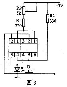 光電耦合器檢測(cè)電路如圖3所示,可將TLP621等四個(gè)引腳的光電耦合器插入插座左端的四個(gè)引腳的插孔中,將TLP332等六個(gè)引腳的光電耦合器插入插座右端的六個(gè)引腳的插孔中。接通電源后,電源經(jīng)RP、R1給IC中的發(fā)光二極管提供一個(gè)正向電壓,發(fā)光二極管發(fā)光,使IC中的光電三極管導(dǎo)通,3腳外接的發(fā)光二極管D發(fā)光,若調(diào)節(jié)RP時(shí),發(fā)光二極管的亮度能跟著變化,則被測(cè)光電耦合器是好的。