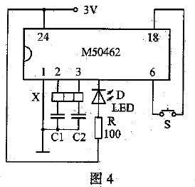 陶瓷振子檢測(cè)電路如圖4所示,外接元件455kHz或500kHz陶瓷振子X,C1、c2與集成電路M50462的2、3腳內(nèi)部電路組成455kHz或500kHz的振蕩電路,將被測(cè)的455kHz或500kHz陶瓷振子插入插孔中,接通電源,按住按鈕開關(guān)S時(shí),發(fā)光二極管能不停地閃爍發(fā)光,則說明被測(cè)陶瓷振子是好的。