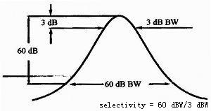 中頻濾波器的頻率選擇性是中頻濾波器的60 dB帶寬與3 dB帶寬之比,如圖3所示。它反映了頻譜儀分辨不等幅信號(hào)的能力,對(duì)于幅度相差60 dB的2個(gè)信號(hào),其間隔至少是60 dB帶寬的一半,才可以分辨出2個(gè)信號(hào),否則小信號(hào)可能被淹沒(méi)在大信號(hào)的裙邊中。用數(shù)字化技術(shù)實(shí)現(xiàn)的窄帶帶通濾波器頻率選擇性可達(dá)到5:1,模擬濾波器頻率選擇性可達(dá)到15:1或11:1。圖3為濾波器的頻率選擇性示意圖。