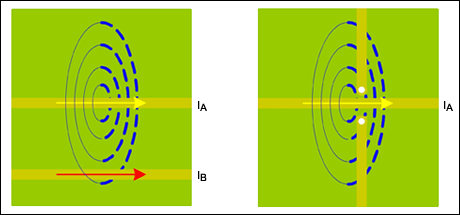 式中,YB是向電路B注入的誤差電壓,IA是在電路A作用的電流1。LM對(duì)電路間距、電感環(huán)路面積(即磁通量)以及環(huán)路方向非常敏感。因此,緊湊的電路布局和降低耦合之間的最佳平衡是正確排列所有電感的方向。