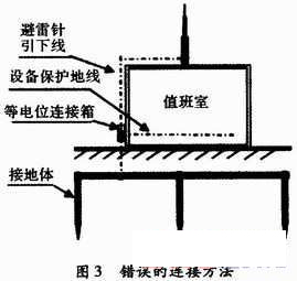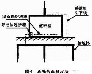 目前,關于共用接地有一種誤解,認為將設備的接地引線無論怎樣連接,最終只要接在同一個接地體上就算是共用接地,如圖3所示。將“共引線”也誤認為是“共地”。其實不然,所謂“共用接地”就是把許多不同性質的接地裝置如電氣安全接地、交流電源工作地、通信及計算機直流地等匯集于一個等電位連接箱,使之成為一個等電位體,然后直接與接地體連接,而防雷地則通過另一條引下線與接地體連接。而不是將室內設備接地與室外防直擊雷接地通過同一根引下線與地相連。更不允許將室內接地引線與室外防直擊雷引線匯集與一個所謂的等電位連接箱,然后再與接地體相連。室內接地引線要遠離室外防雷引下線,如圖4所示。否則,遇雷擊時,強大的雷電流在通過引線向大地泄放的同時,室內引線及所有設備上瞬間便會產生很高的電位差,設備難免遭到破壞。另外,假設與接地體相連的引線因銹蝕斷開或等電位連接端子接觸不良,一旦發(fā)生雷擊,強大的雷電流便會直擊至值班室設備上,這是非常危險的。