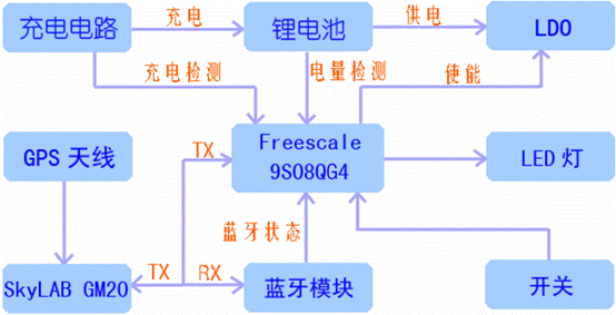 藍(lán)牙GPS模塊也是一個(gè)小小的便攜設(shè)備,需要實(shí)現(xiàn)電源的管理、GPS數(shù)據(jù)的處理、藍(lán)牙狀態(tài)的判斷以及點(diǎn)亮指示燈等功能。這都要求使用一個(gè)MCU來協(xié)調(diào)控制整機(jī)的工作。
