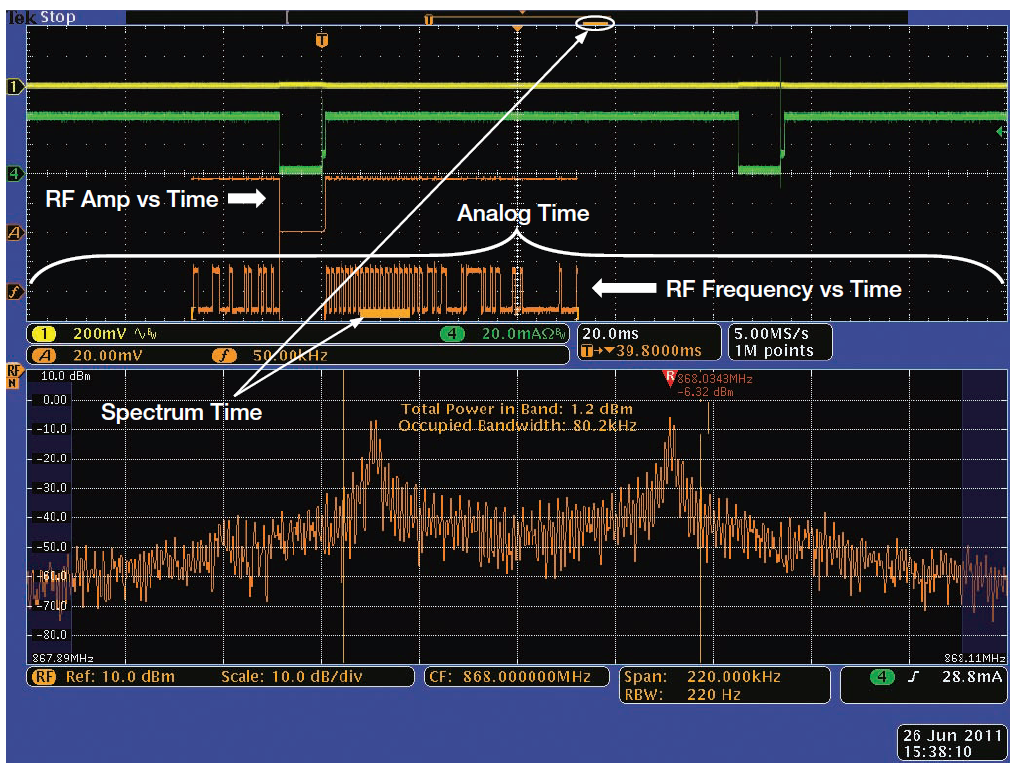 畫面的下半部分顯示了RF信號(hào)的頻域視圖,在本例中是無線電發(fā)射機(jī)輸出,畫面的上半部分是時(shí)域的傳統(tǒng)示波器視圖。頻域視圖中顯示的頻譜來自時(shí)域視圖中短橙色條指明的時(shí)間周期,稱為頻譜時(shí)間(Spectrum Time)。