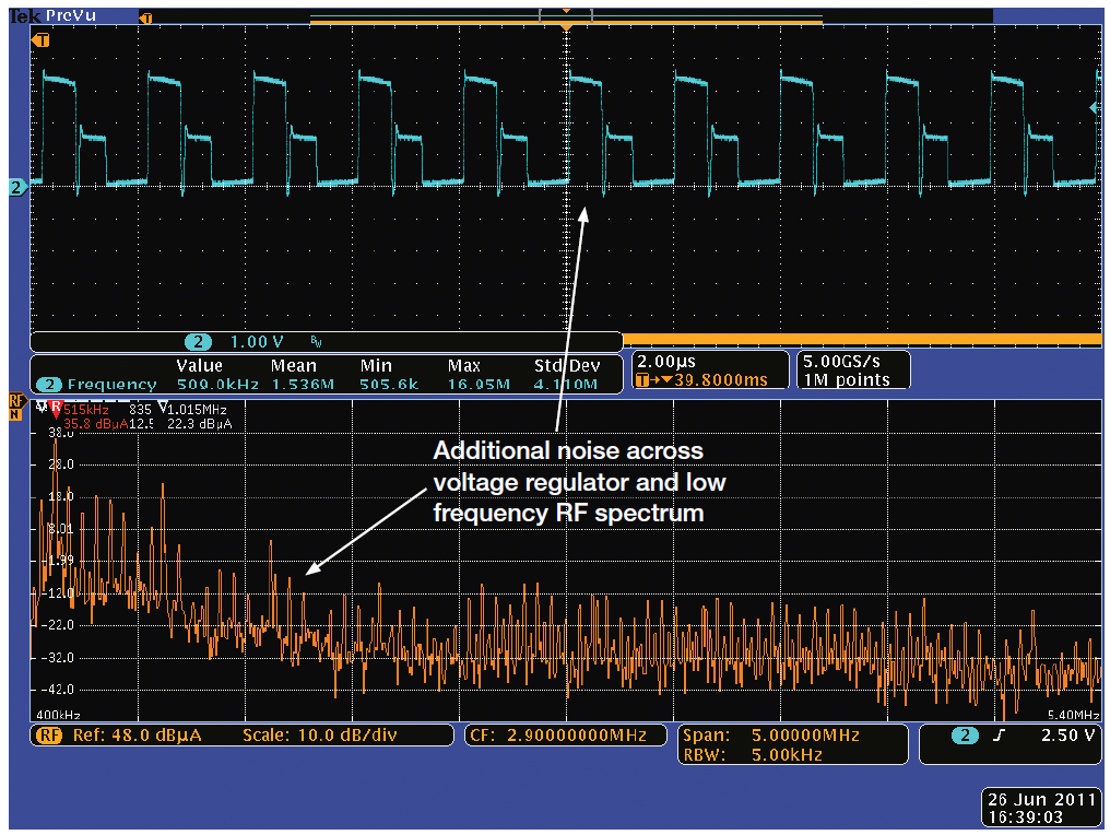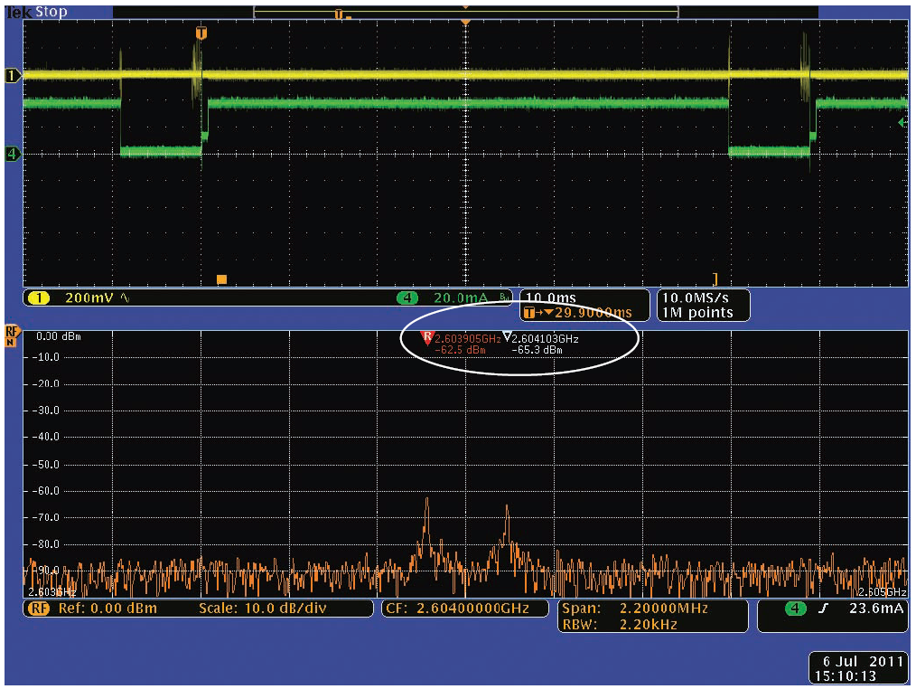 上圖是在使用干凈的實(shí)驗(yàn)室電源供電的模塊中獲得的,這在實(shí)際環(huán)境中很難實(shí)現(xiàn),但可以作用實(shí)用參考。圖4顯示了相同的RF信號(hào),但使用升壓型開關(guān)電源為無線電模塊供電。升壓穩(wěn)壓器因產(chǎn)生噪聲而臭名昭著,但它允許使用一個(gè)或兩個(gè)堿性或鎳鎘單元及相對(duì)較少的器件,降低了成本。注意被調(diào)制信號(hào)底部的噪聲提高。在發(fā)送的信號(hào)附近,噪聲至少要比干凈的電源高5 dB。噪聲已經(jīng)容易地顯現(xiàn)在電流波形和電壓波形中。額外的噪聲還會(huì)令從發(fā)射機(jī)收集這些數(shù)據(jù)所使用的接收機(jī)上的信號(hào)信噪比劣化,降低無線電系統(tǒng)的有效范圍。