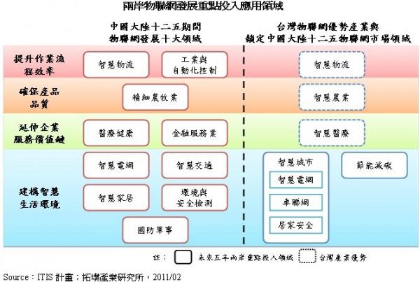 歐美經(jīng)濟(jì)體危機(jī)四伏,中國大陸市場需求反而撐起全球經(jīng)濟(jì)半邊天。不可諱言,面對全球不景氣環(huán)境,未來兩岸合作將是臺灣經(jīng)濟(jì)得以維持成長的主要動能之一。根據(jù)拓墣產(chǎn)業(yè)研究所ITIS計劃顯示,目前全球皆密切關(guān)注的“中國大陸十二五規(guī)劃”中,對于通訊基礎(chǔ)建設(shè)和IC產(chǎn)業(yè)的高度重視,連帶也為“物聯(lián)網(wǎng)”產(chǎn)業(yè)的快速發(fā)展埋下伏筆。