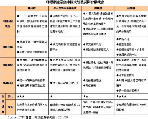 感知層一直以來都是臺廠之強(qiáng)項,加上中國大陸目前技術(shù)較為薄弱,短期臺灣感測芯片廠具有較大之優(yōu)勢。應(yīng)用部分,智能電網(wǎng)與智能醫(yī)療在中國大陸將是最大的應(yīng)用領(lǐng)域與投資方向。但由于物聯(lián)網(wǎng)應(yīng)用范圍廣大,涉及各個層面,資源難以集中發(fā)展,臺廠可藉由差異化案例作為利基,將解決方案包裝后整案輸出。例如,臺灣目前推動的智能生活計畫,所積累的物聯(lián)網(wǎng)發(fā)展經(jīng)驗及成熟技術(shù),如智能農(nóng)業(yè)、智能醫(yī)療、智能電表等,都是臺廠可藉力使力、搶攻物聯(lián)網(wǎng)應(yīng)用市場的機(jī)會。